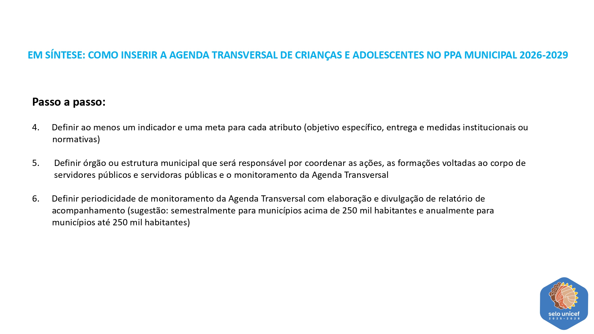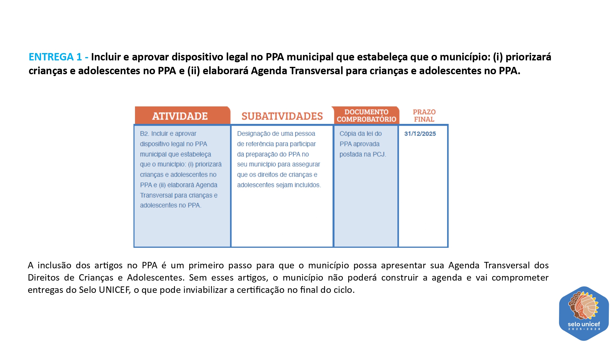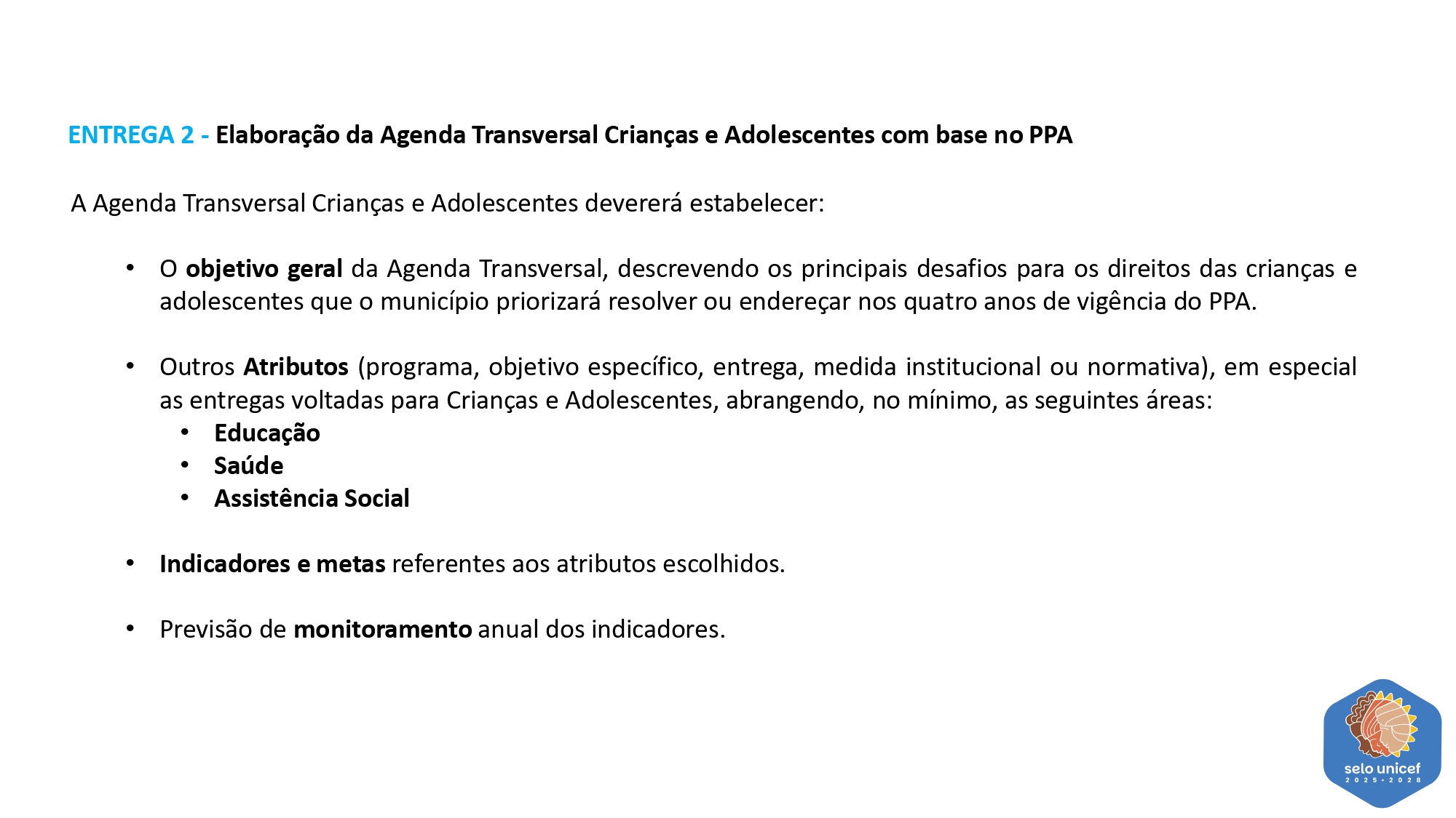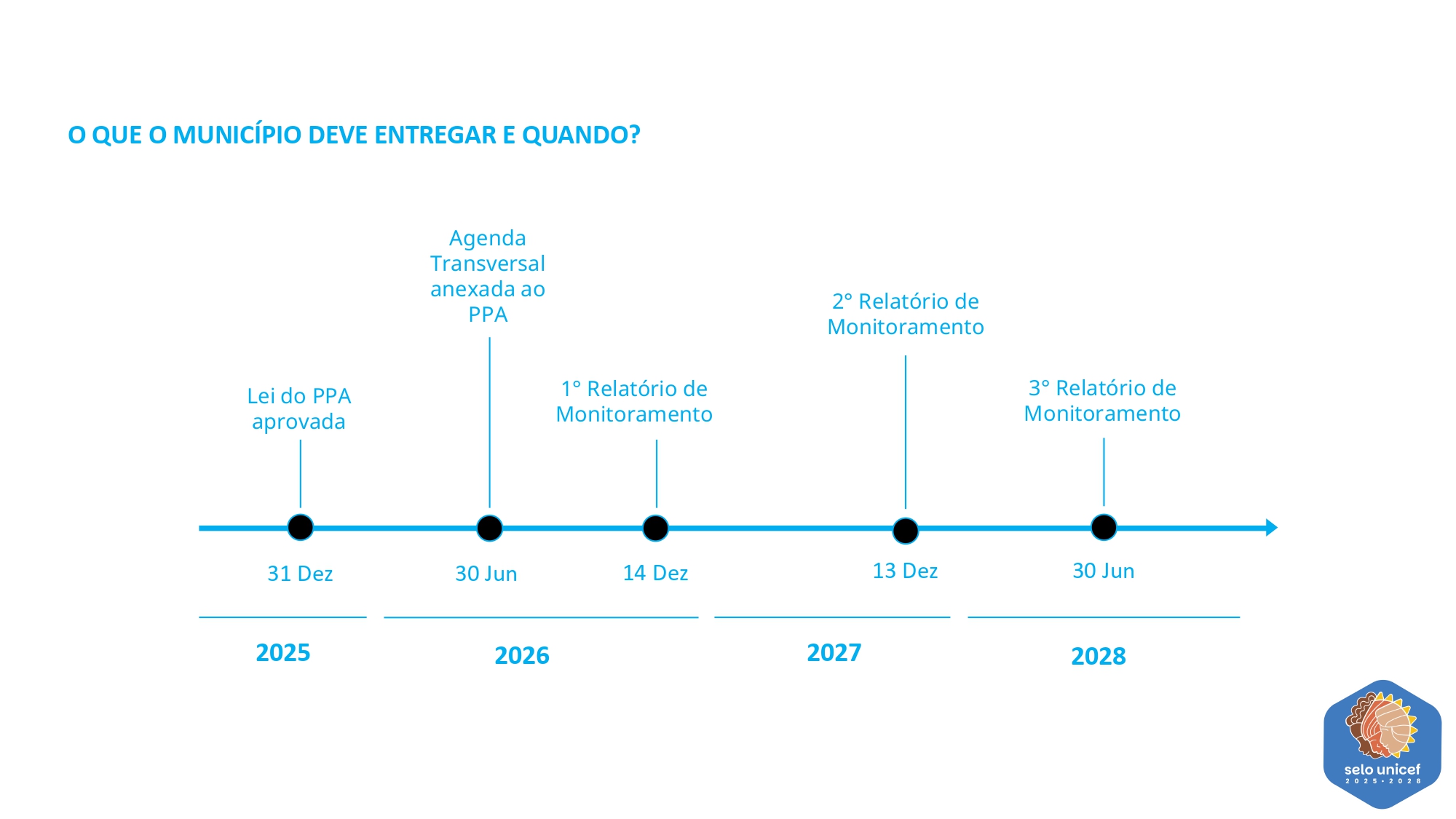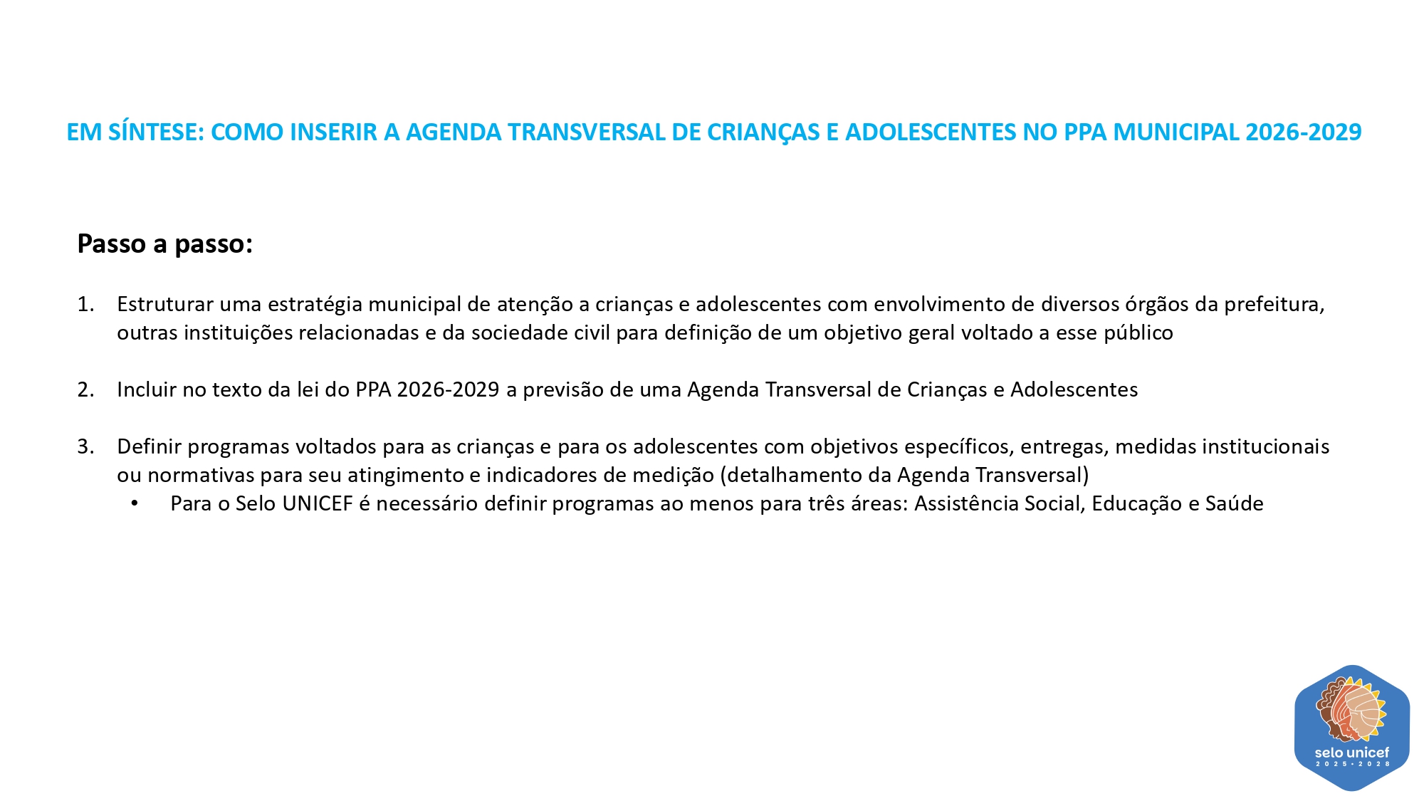 - Para alcançar a certificação do Selo UNICEF ao final de 2028, os municípios participantes deverão estabelecer, ainda em 2025 e em dispositivo (artigo ou inciso) do Projeto de Lei do PPA municipal, que o município tem por objetivo a priorização das crianças e adolescentes nos anos de vigência do PPA. Associado a tal dispositivo, o município deverá atrelar um outro dispositivo prevendo a elaboração de uma Agenda Transversal para crianças e adolescentes no PPA, a ser regulada por normativa própria e posterior, ou que figure como anexo da lei do PPA municipal.