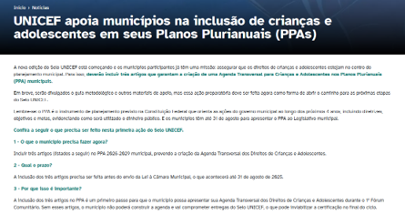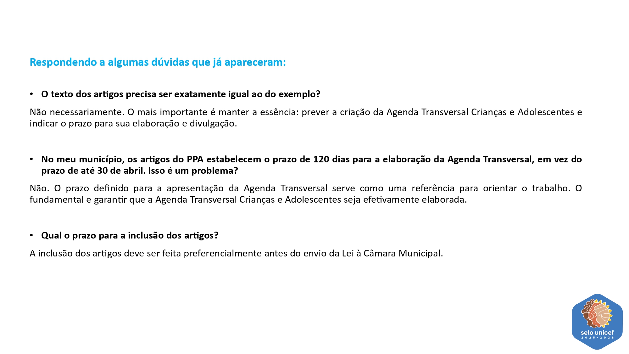 A inclusão dos artigos no PPA é um primeiro passo para que o município possa apresentar sua Agenda Transversal dos Direitos de Crianças e Adolescentes. Sem esses artigos, o município não poderá construir a agenda e vai comprometer entregas do Selo UNICEF, o que pode inviabilizar a certificação no final do ciclo.