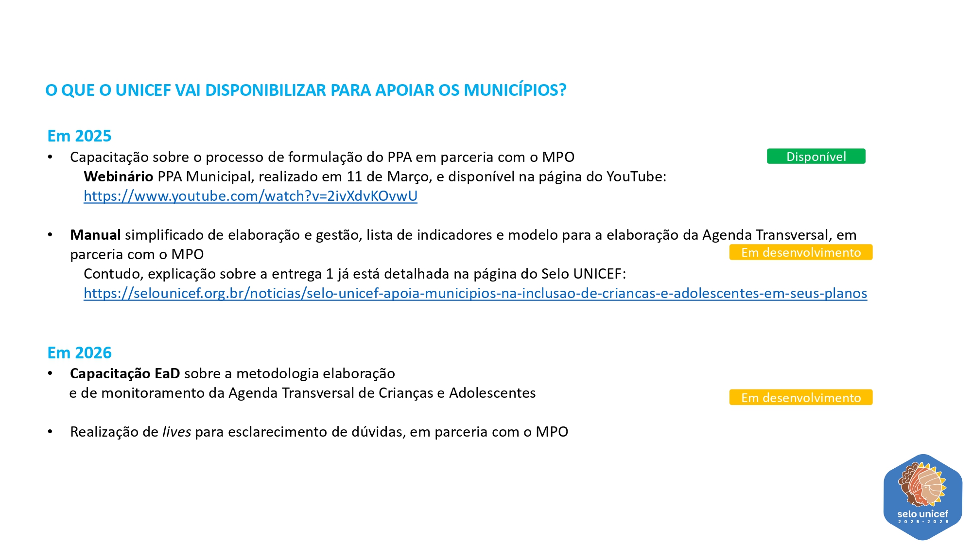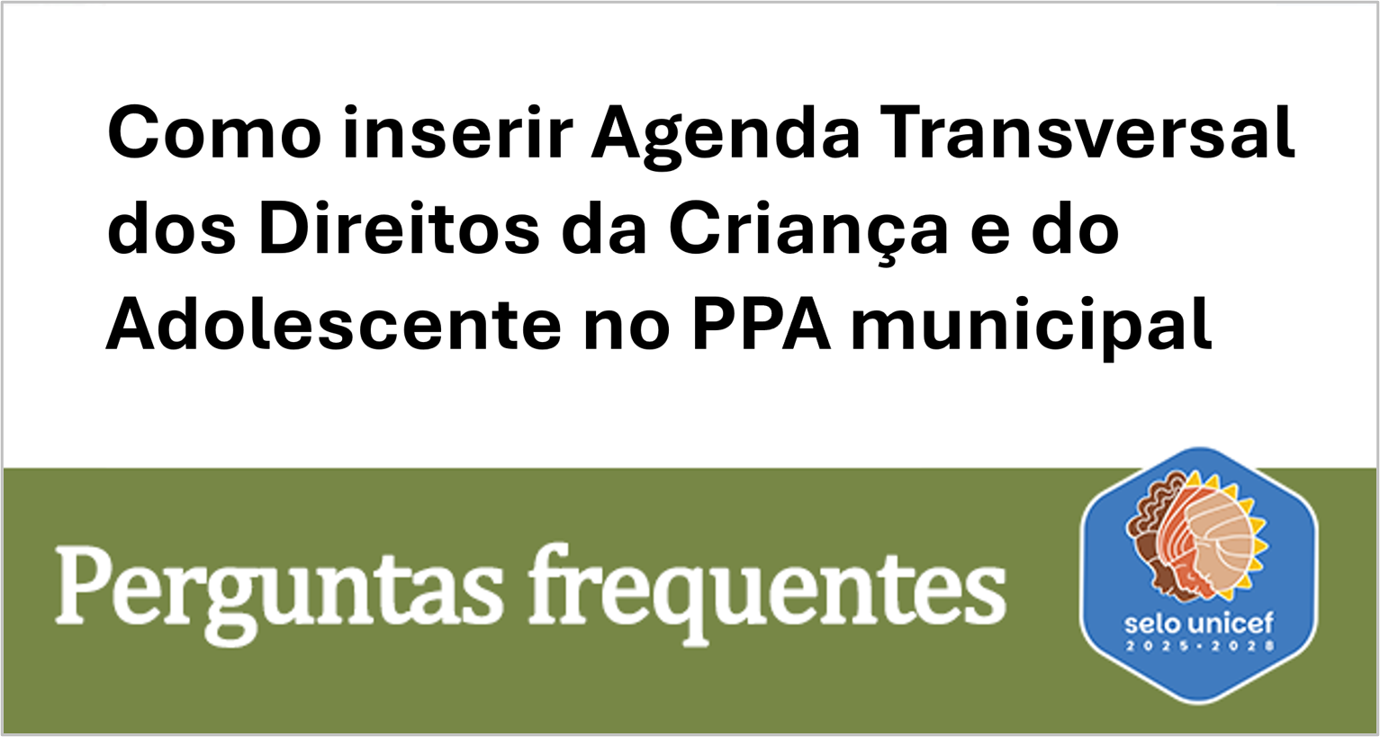 Nesta edição do Selo UNICEF, a Agenda Transversal dos Direitos da Criança e do Adolescente inserida corretamente no Plano Plurianual (PPA) Municipal para 2026-2029 será um instrumento importante de trabalho para que prefeituras, câmaras de vereadores, CMDCA e outros envolvidos na gestão municipal e para propor, acompanhar e avaliar o processo orçamentário e, com isso, assegurar orçamento para as políticas públicas voltadas a meninas e meninos. Esta atividade é obrigatória para pontuar no Eixo de Participação Social e Gestão por Resultados e, com isso, consequentemente, assegurar orçamento para as políticas públicas voltadas a meninas e meninos.